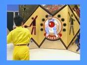 Unfortunately, the contestant's only throw has missed the balloon.
